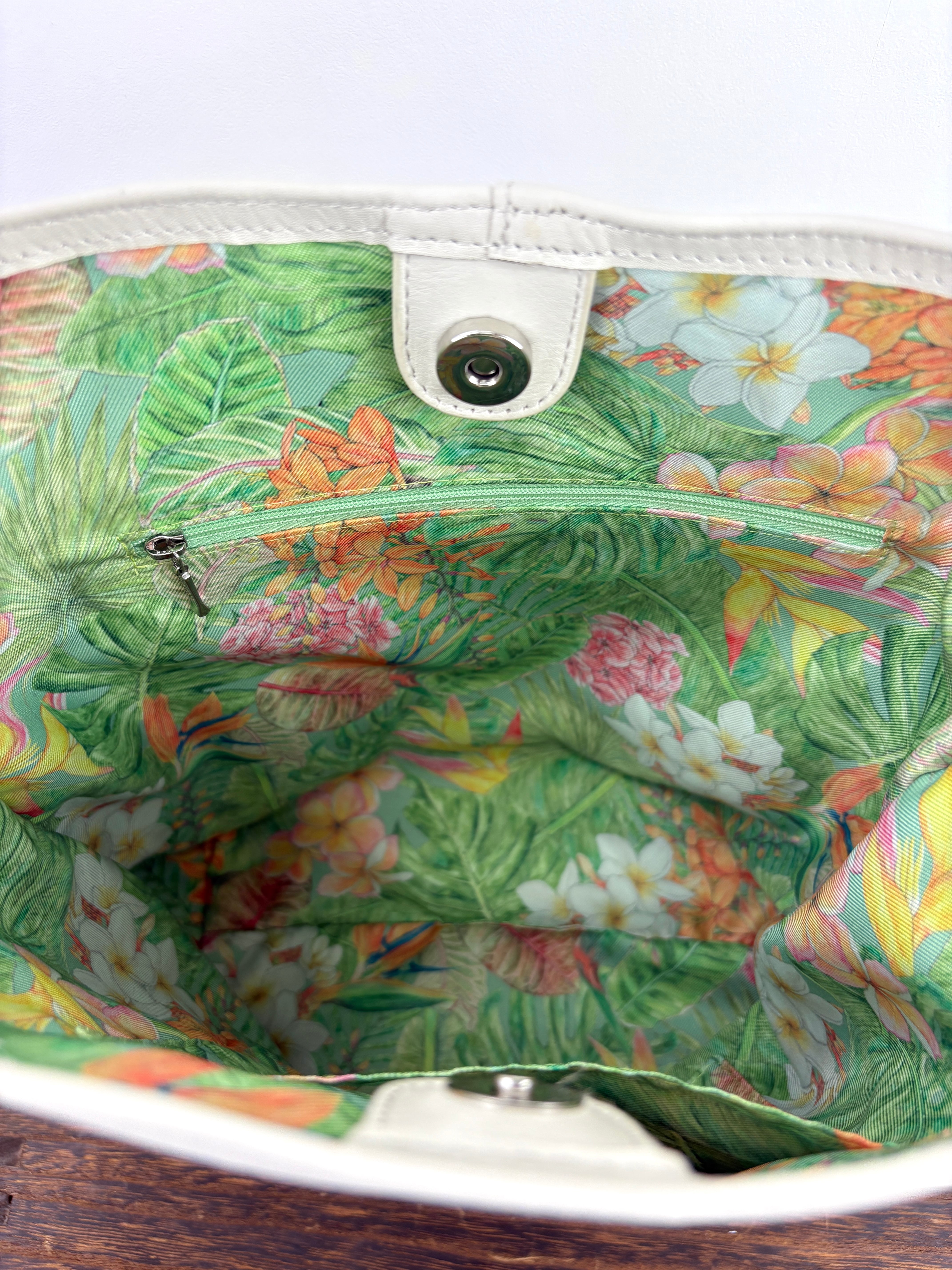 裏地は、OFFにはトロピカルなリーフフラワー柄を、NAVYにはブルーのトラ柄&バティック柄を使用しています。