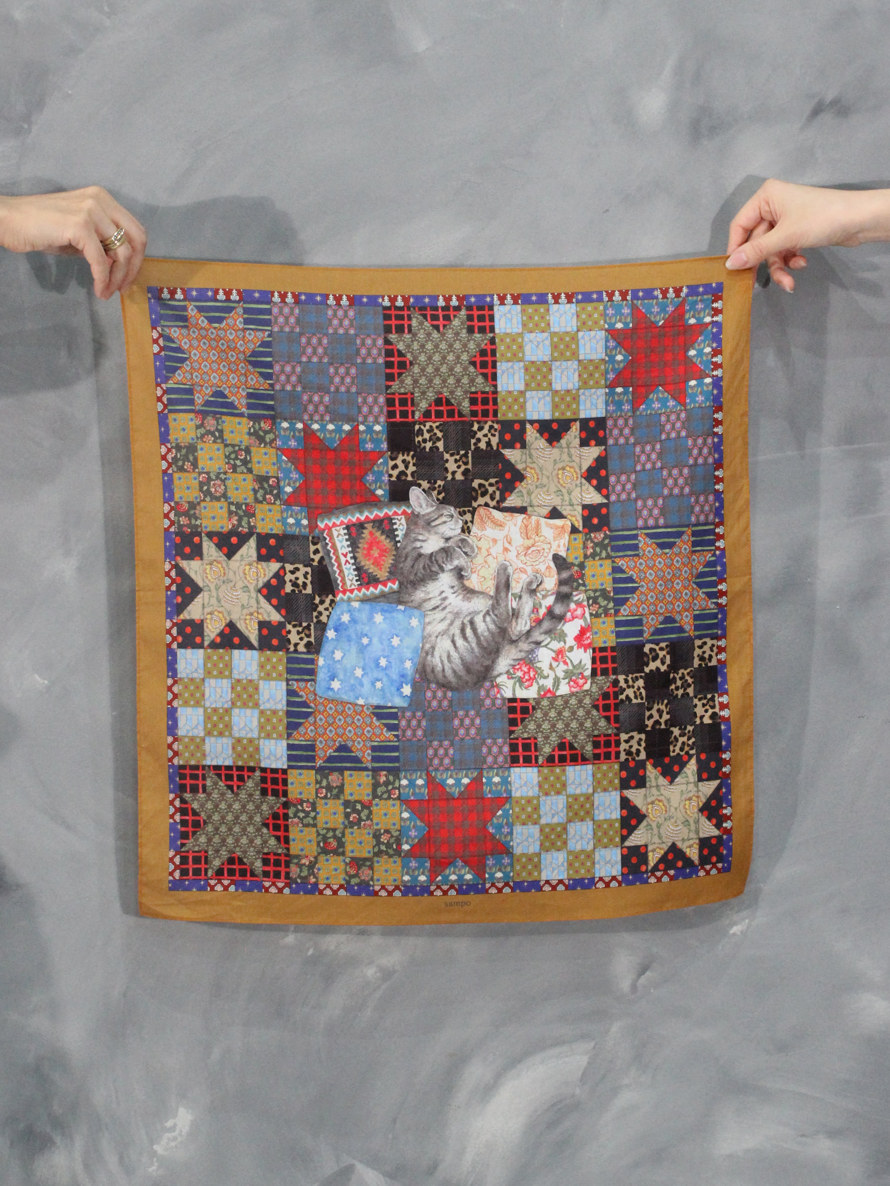 「スターキルト」という星の模様をデザインしたキルトのなかに、sampoらしい柄を詰め込みました。多彩な柄の組み合わせは、デザイナーの中のあふれた柄宇宙を表現しています。