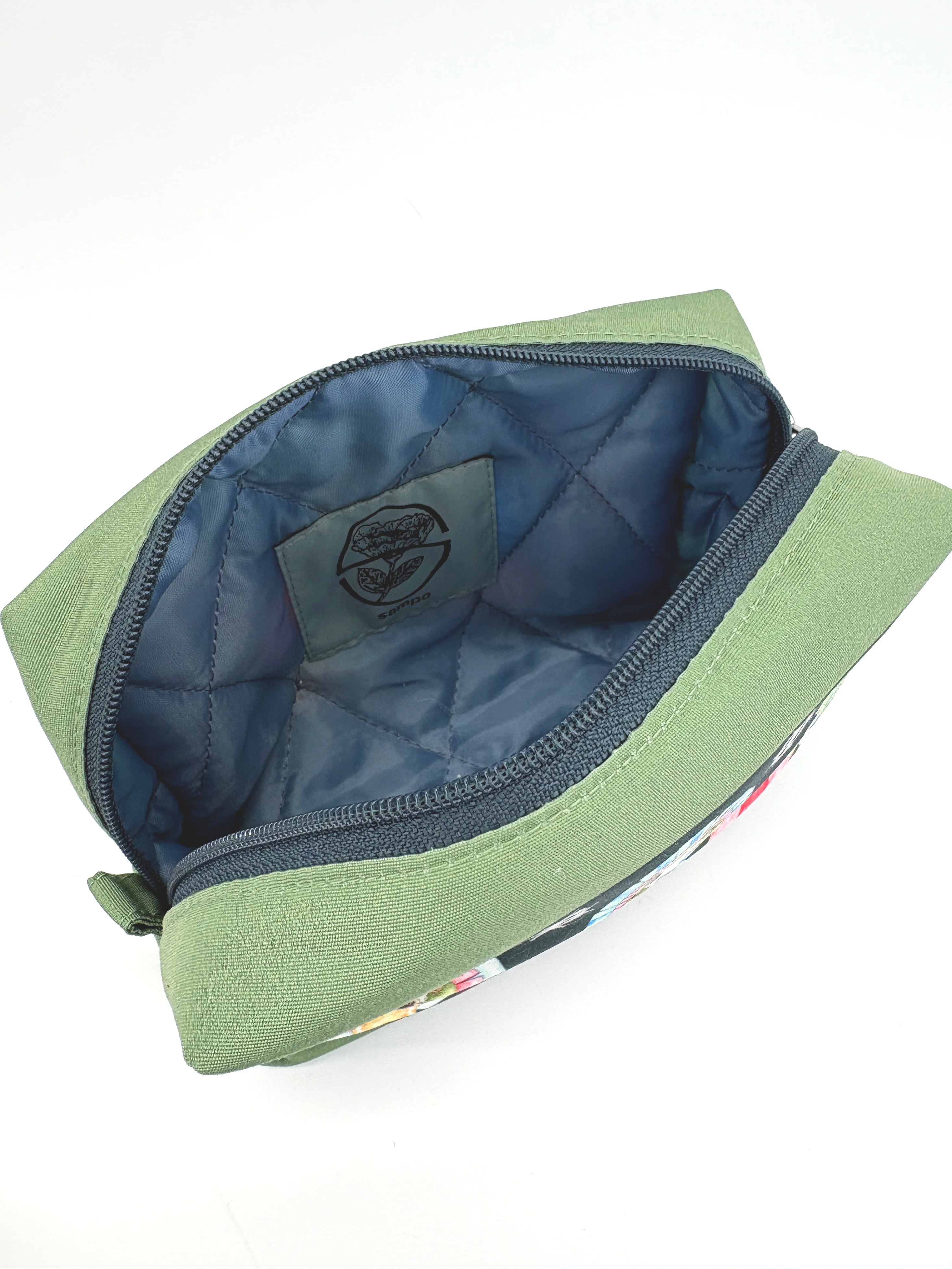 裏地にはポリエステルの中綿キルトを使用していますので、瓶の化粧品など持ち運ぶ際におすすめです。(内容品を完全に保護するものではありません。)