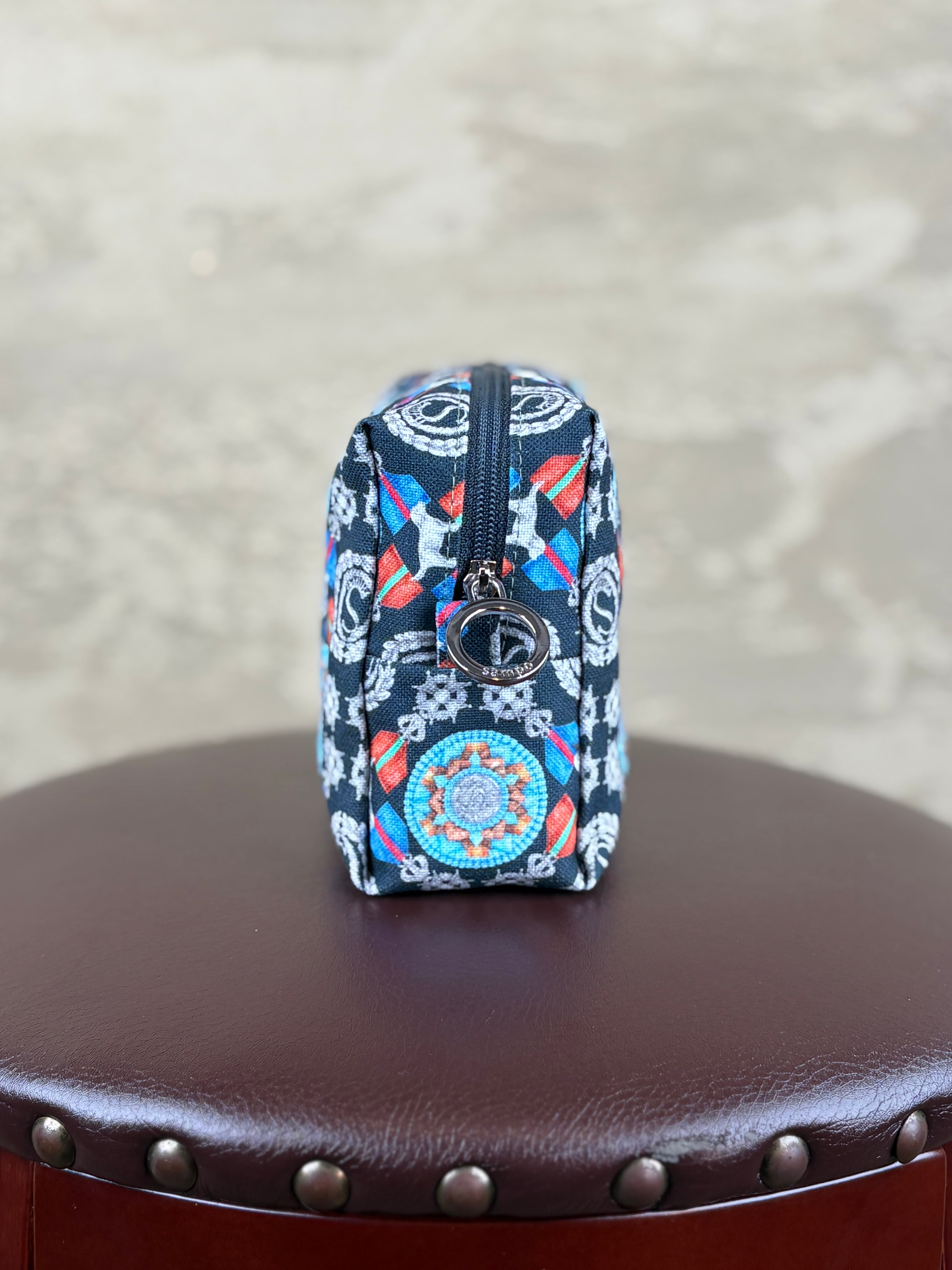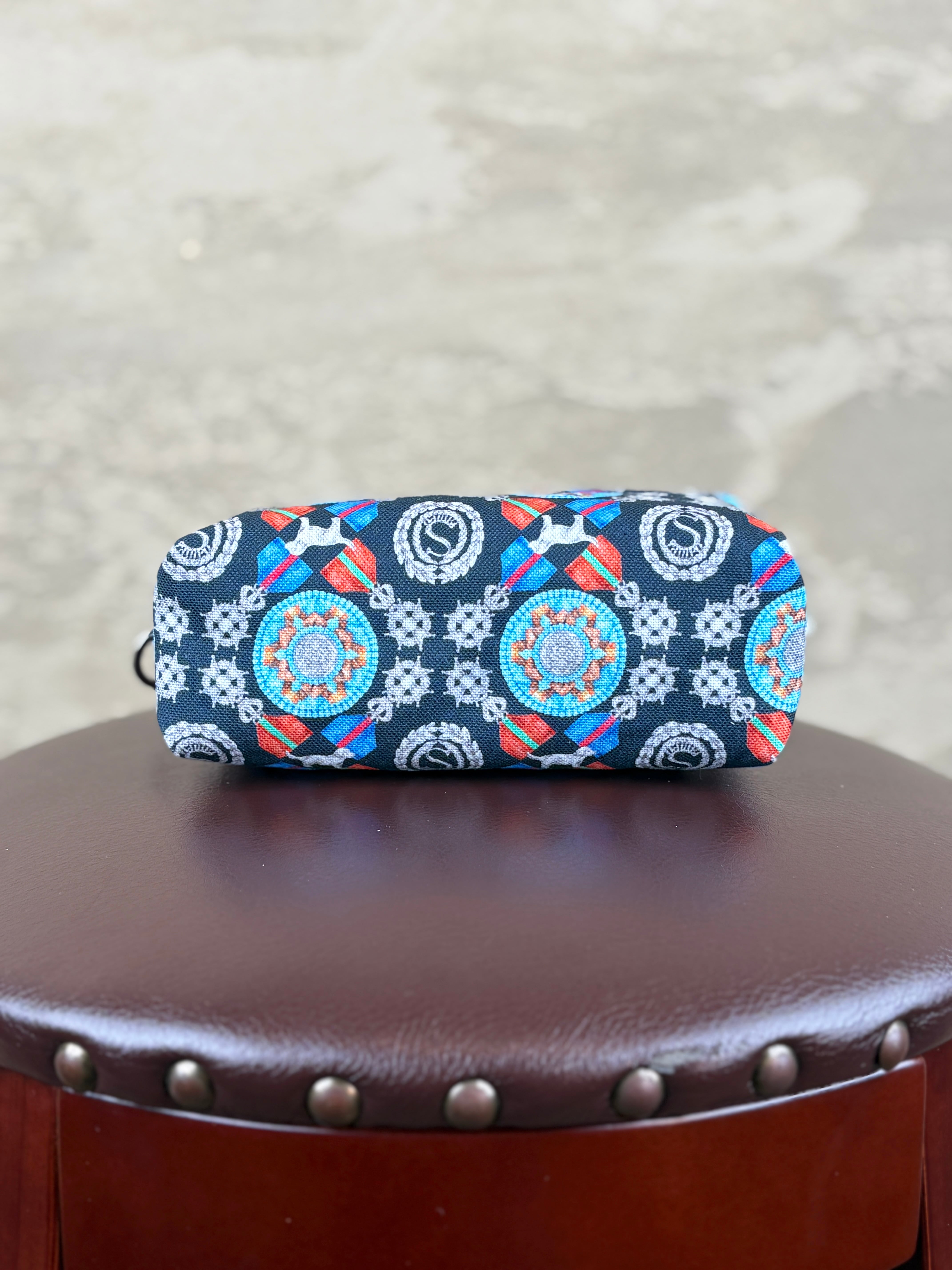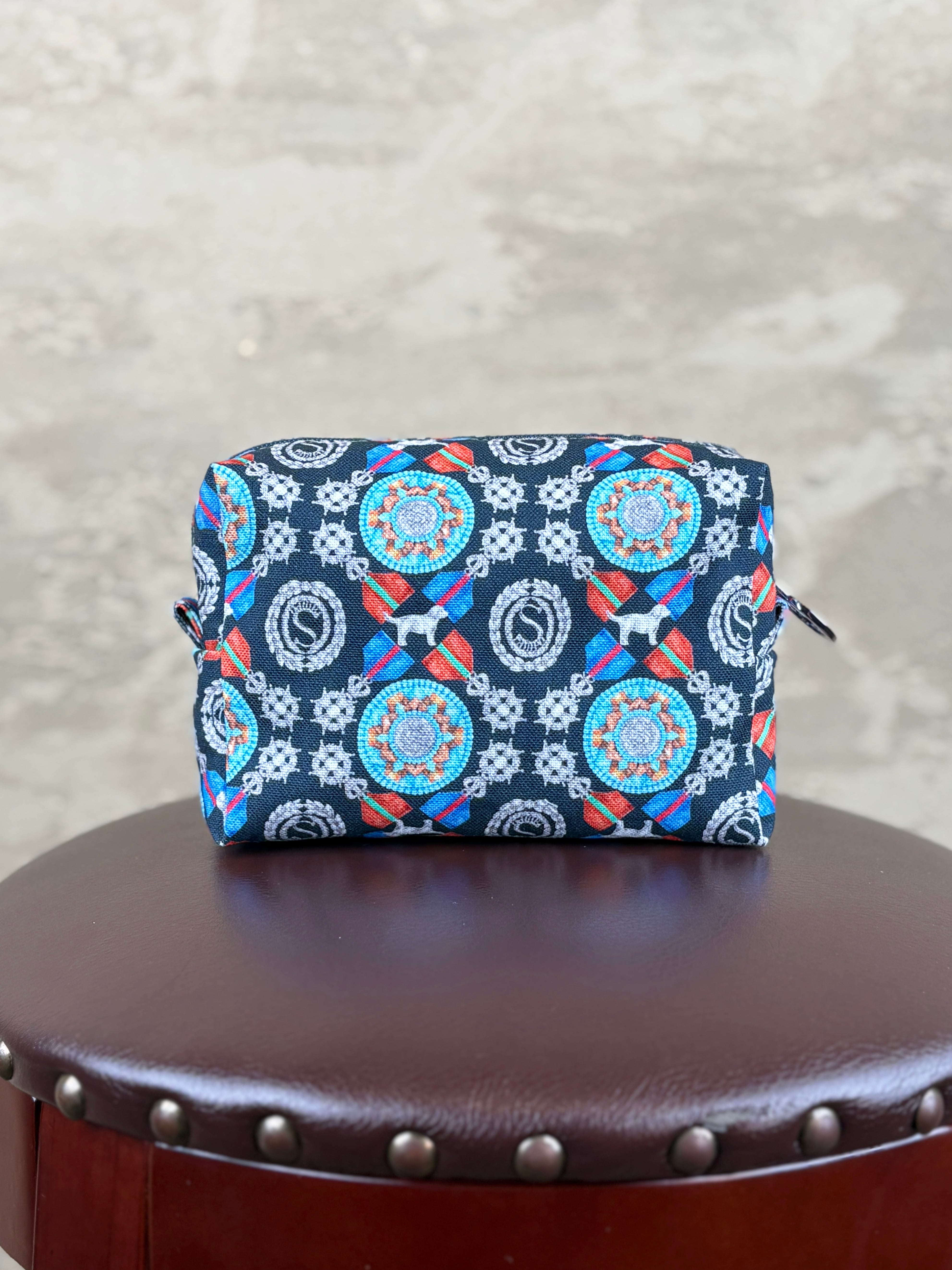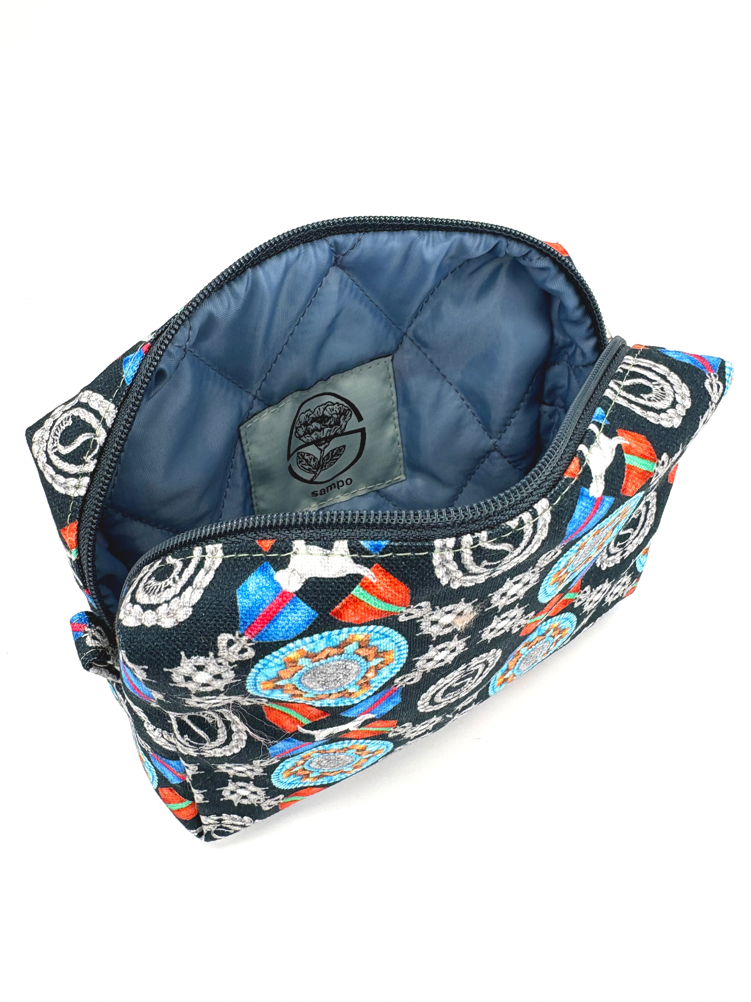 オリジナルのイラストテキスタイルを使用した綿キャンバスのボックス型化粧ポーチです。