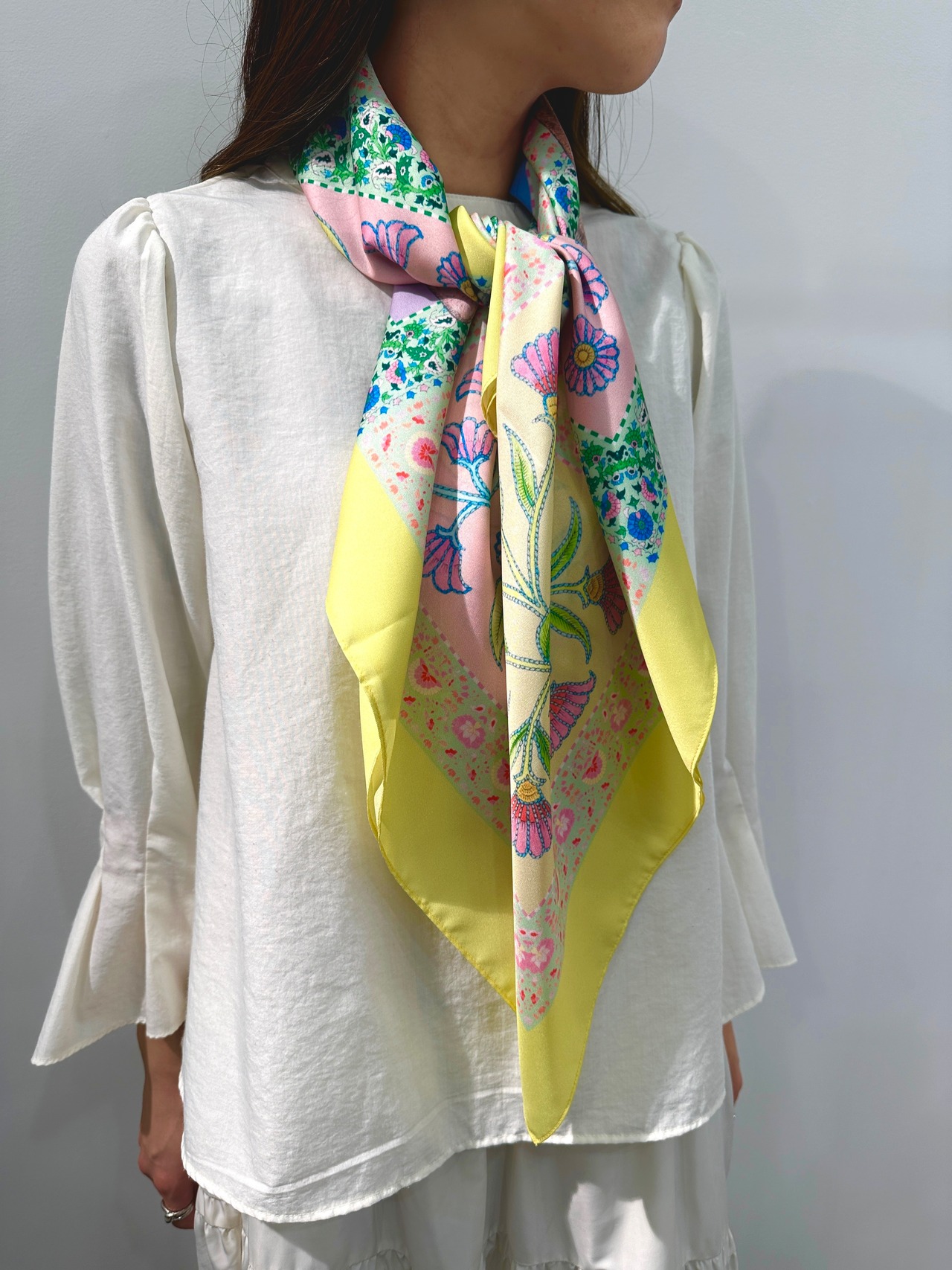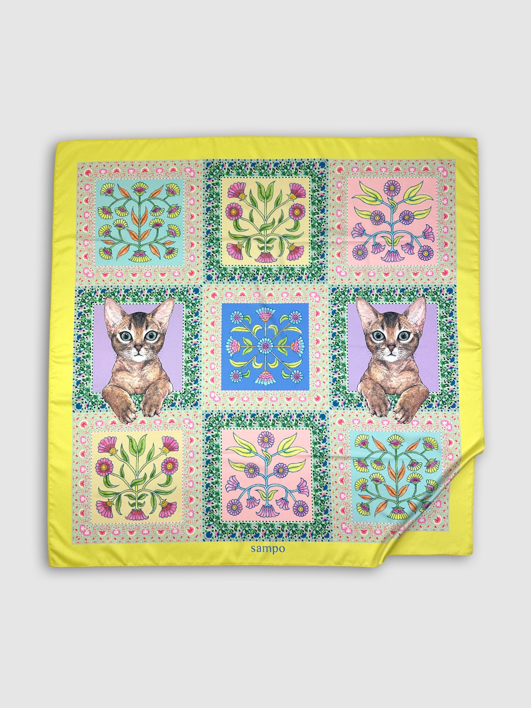 刺繍モチーフの草花が描かれたモチーフの中から、ひょっこりと顔を出している猫がポイントの柄です。ベースのイエローカラーが春夏らしい爽やかな柄です。ブロックの枠部分にも細やかな刺繍モチーフの柄があり、細部までこだわっている柄となっています。