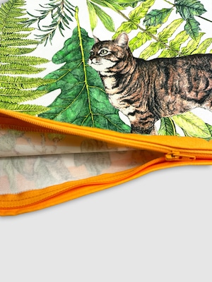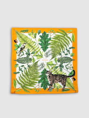 様々な草葉がボタニカルな印象を与える一柄です。細やかな草葉のイラストの中にいる、鳥と散歩している猫がsampoらしさを感じさせる柄となっています。オレンジと白のコントラストも草葉のグリーンを引き立たせています。同じイラストを使用していますが、カラーが異なるだけで印象が全く異なるピンクカラーとの違いもお楽しみいただけます。