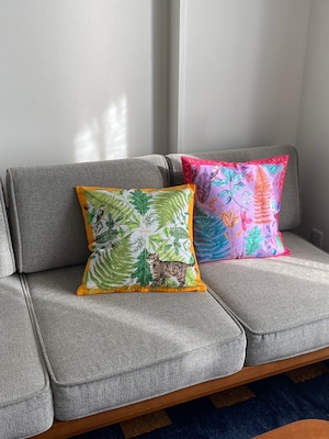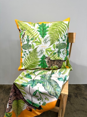 一般的な45cm角のサイズで、デザイナーが手書きで描いたイラストを用いたテキスタイルを最大限楽しめる仕様となっています。