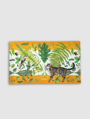 様々な草葉がボタニカルな印象を与える一柄です。細やかな草葉のイラストの中にいる、鳥と散歩している猫がsampoらしさを感じさせる柄となっています。オレンジと白のコントラストも草葉のグリーンを引き立たせています。同じイラストを使用していますが、カラーが異なるだけで印象が全く異なるピンクカラーとの違いもお楽しみいただけます。