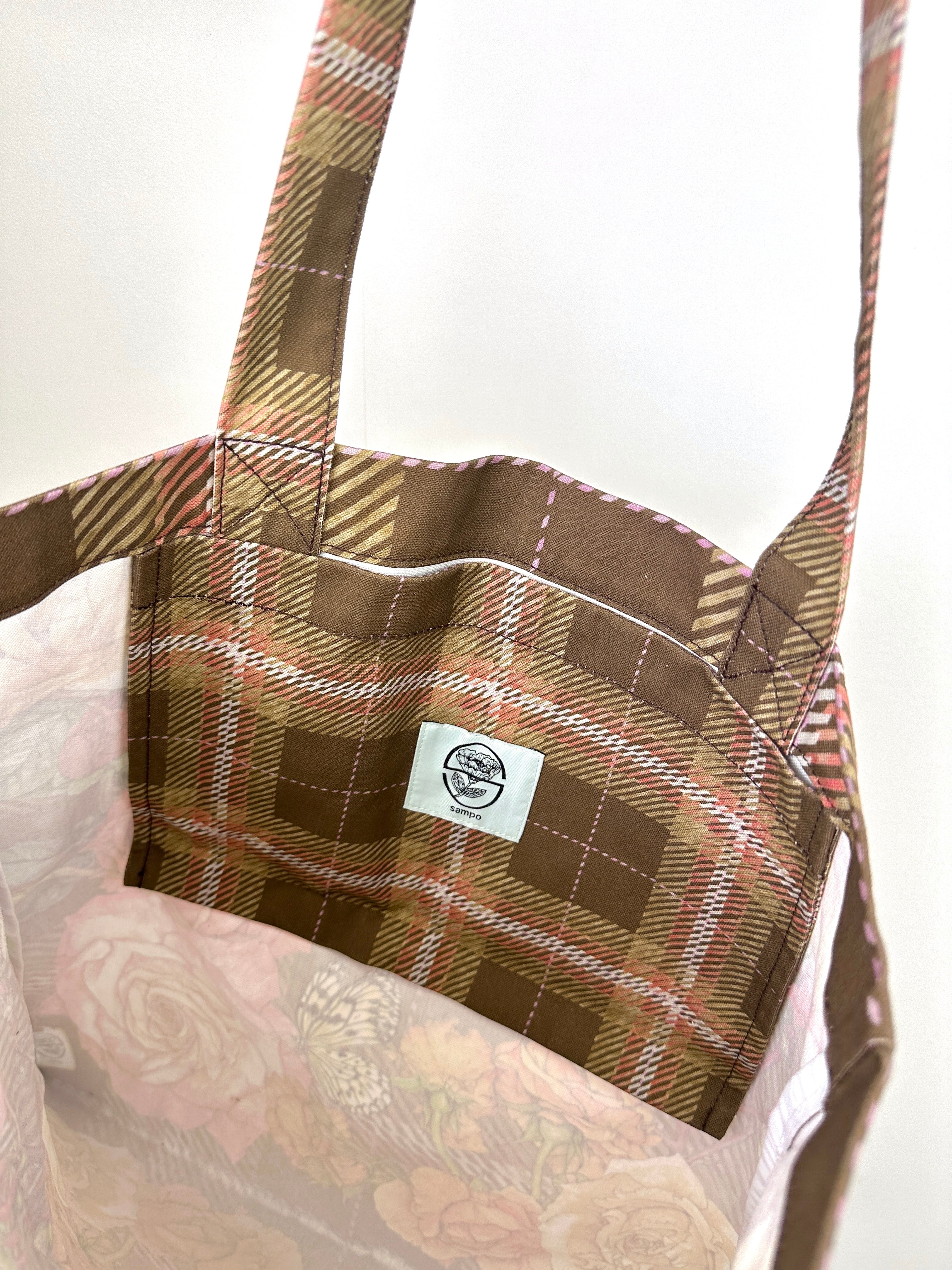 ポケットとハンドルは同柄の総柄プリントで織りネームがついた仕様になります。