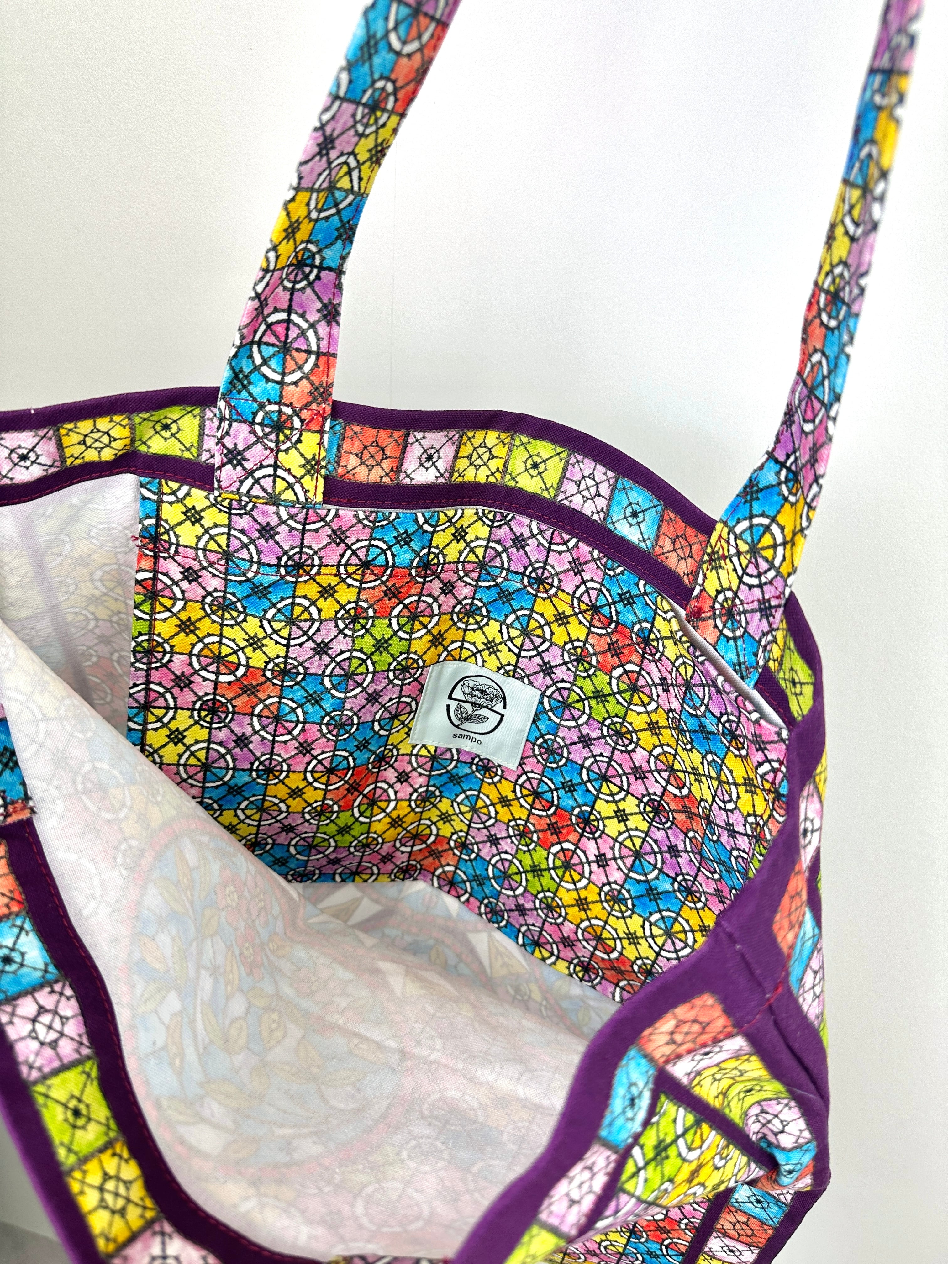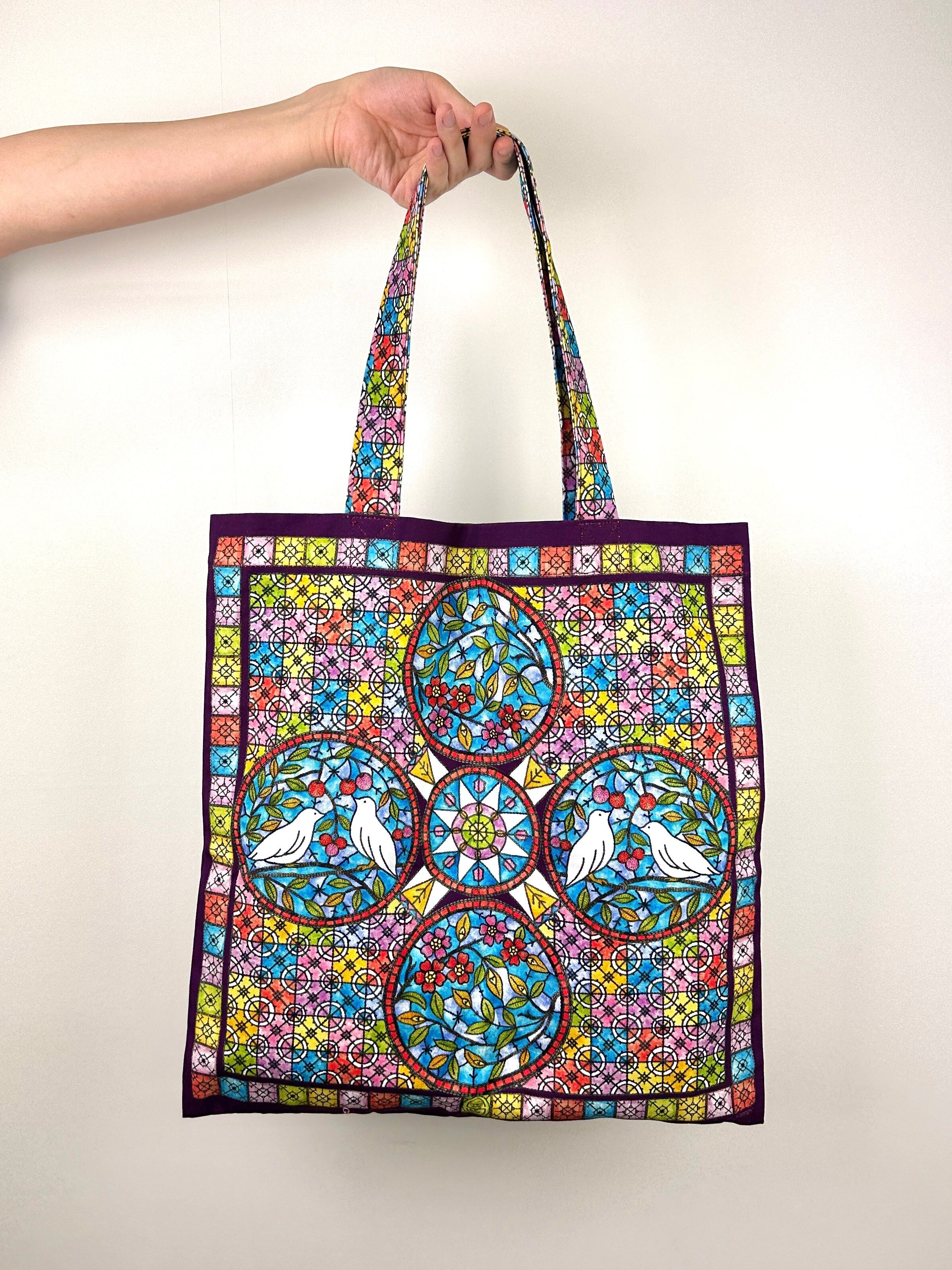 オリジナルのイラストテキスタイルを使用した大判サイズの綿キャンバストートバッグです。