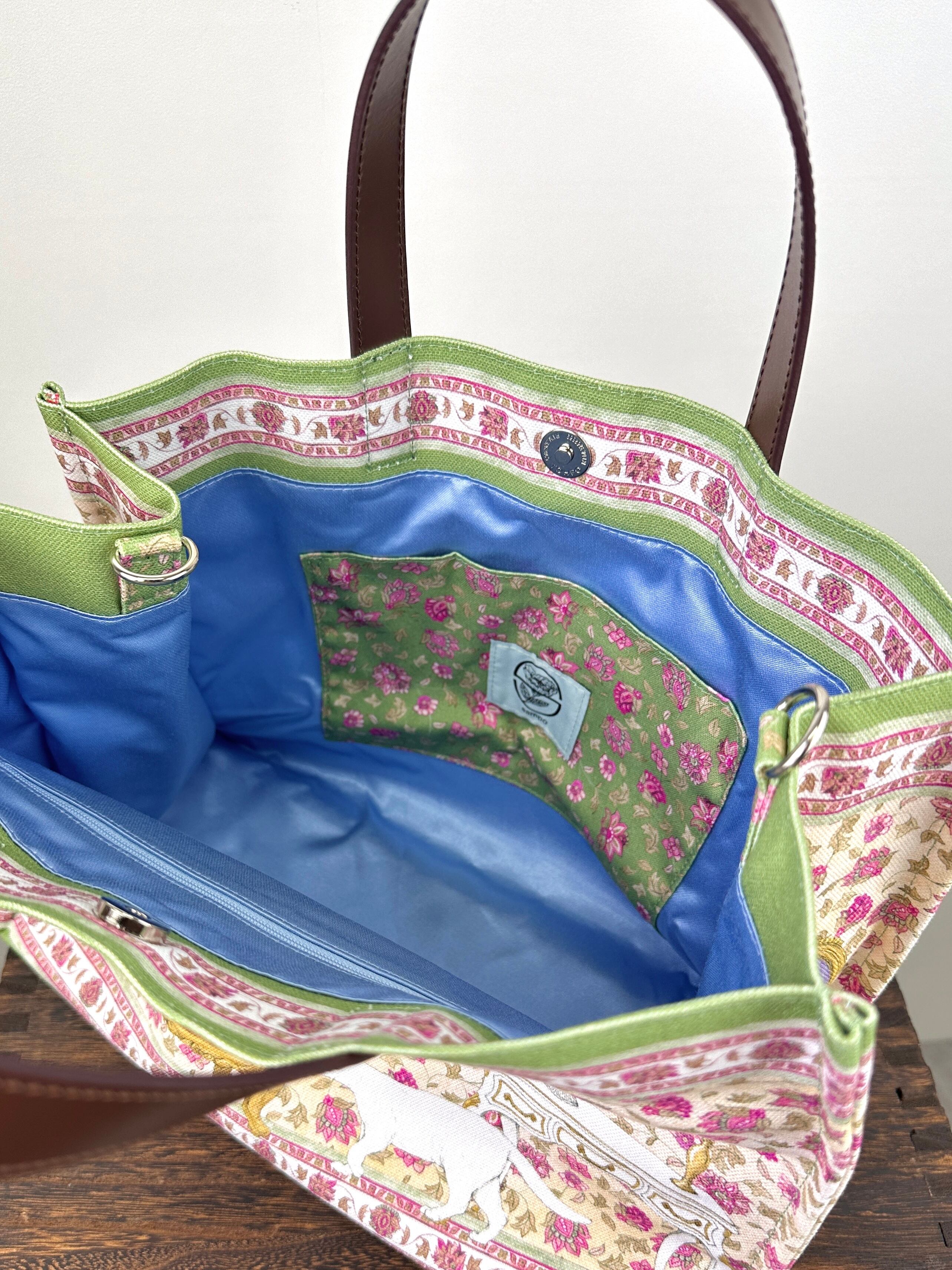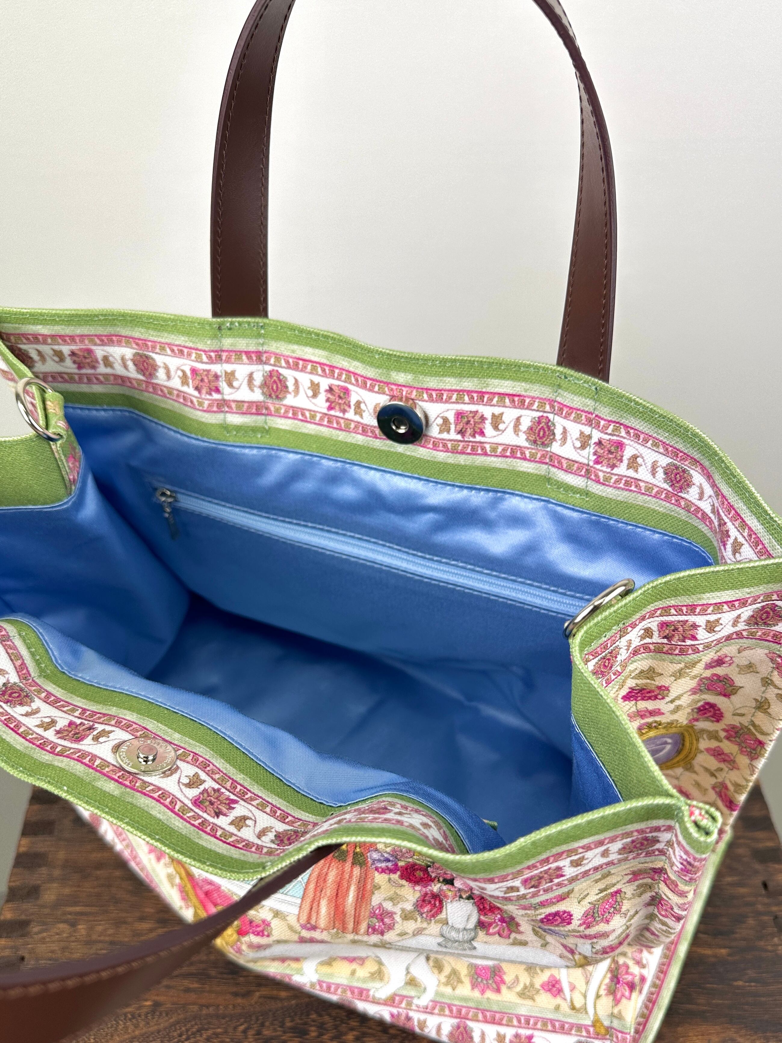 内側には大きめのファスナーポケットと柄の入ったオープンポケットが付属しており、ファスナーポケットには長財布などもいれることができます。
