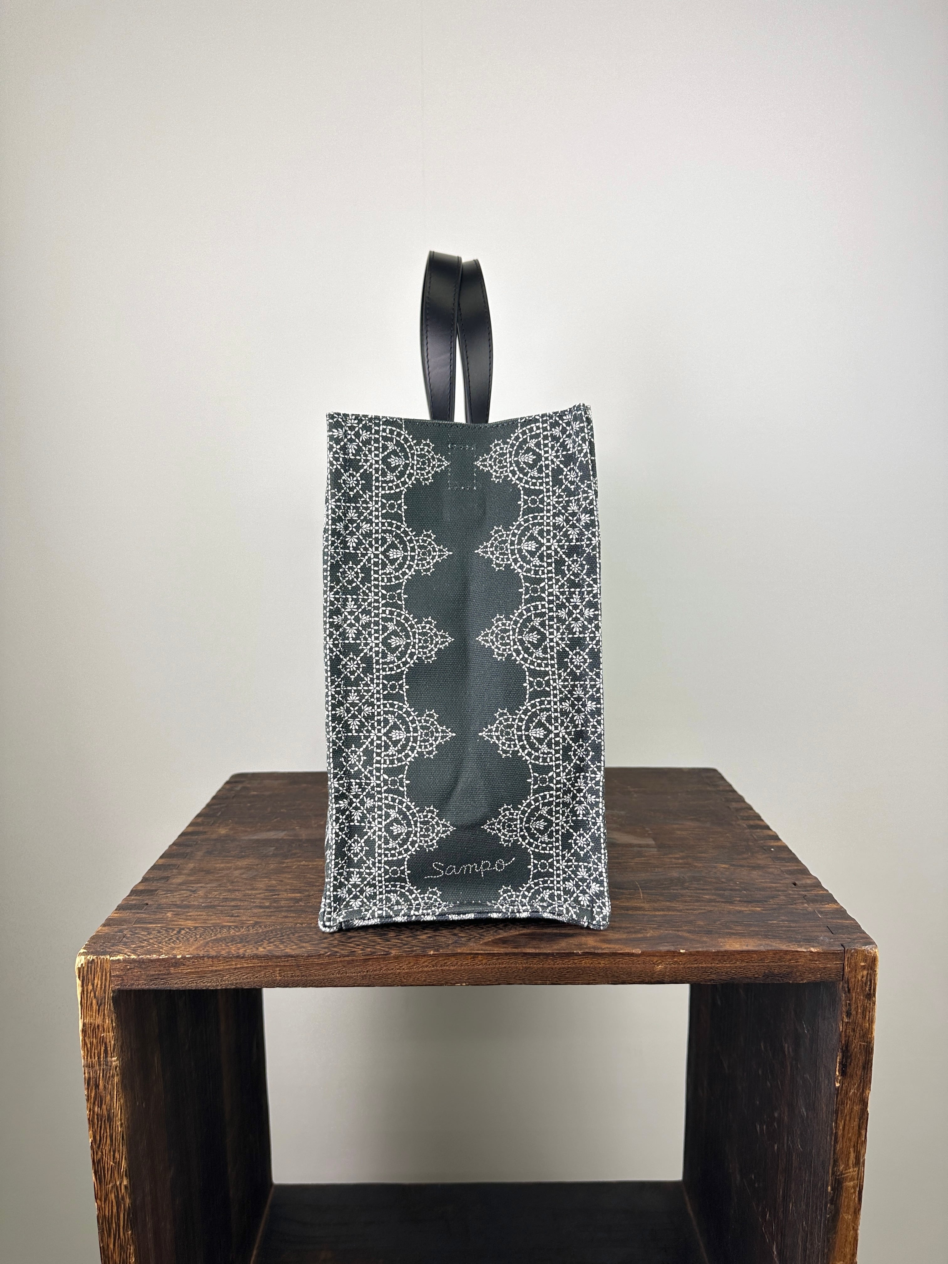 邸宅に飾らているレース細工をモチーフに描いた一柄。細やかなレースの質感を丁寧に描くとともに、鳥や草花といった、sampoでも良く描かれるモチーフをレースの柄に組み込みました。同じ絵柄を使用しながら、全く異なる雰囲気に仕上げたステンドグラスパープル柄と合わせてご使用いただくのもおススメです。
